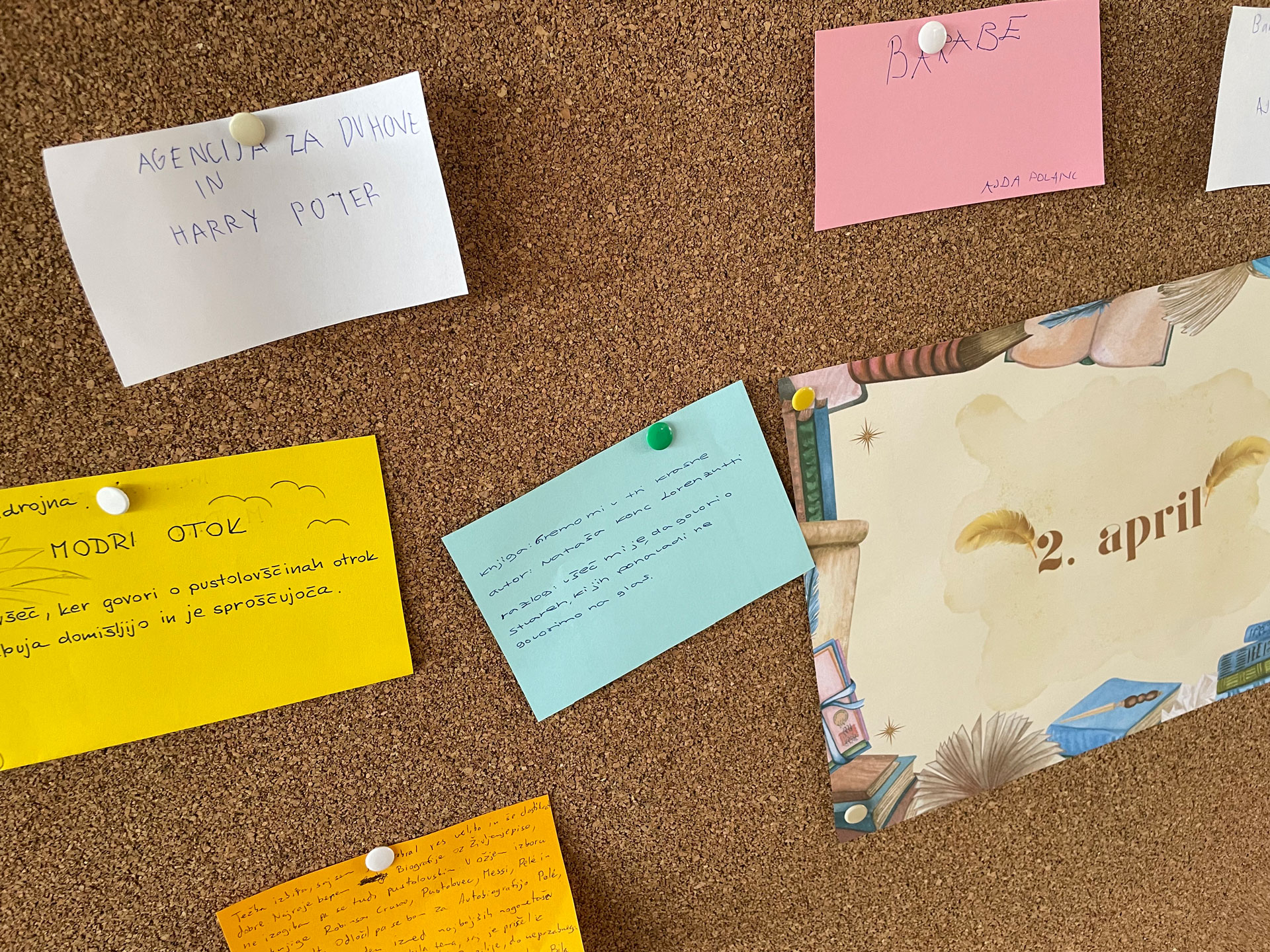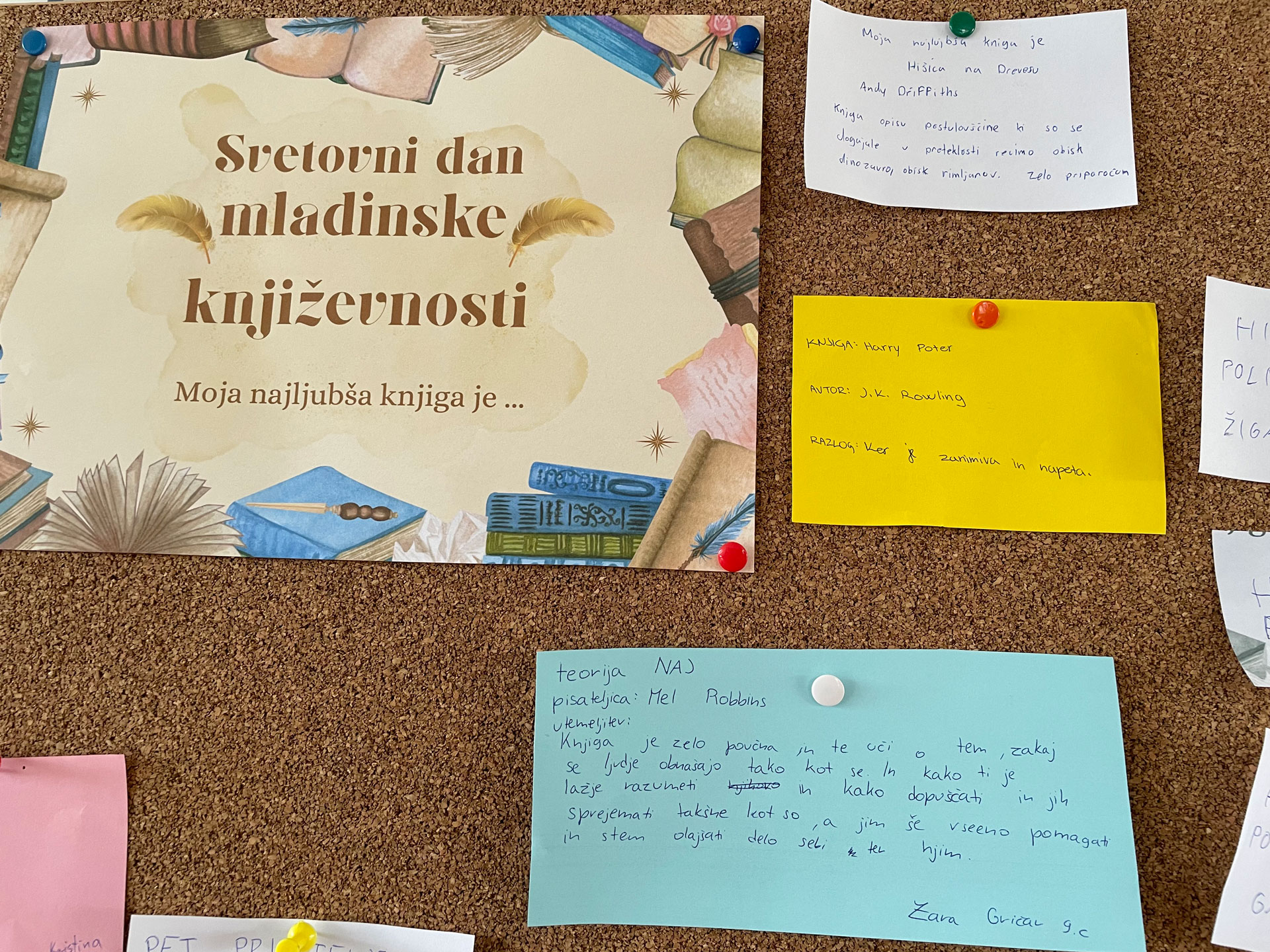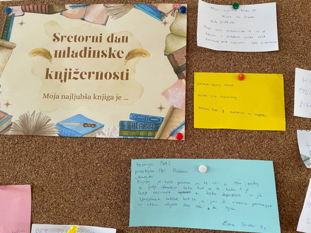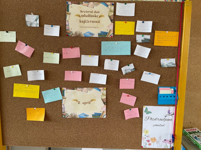 Ob mednarodnem dnevu mladinske književnosti, 2. aprila, smo v šolski knjižnici pripravili posebno dejavnost, s katero smo želeli spodbuditi učence k razmišljanju o branju in deljenju svojih bralnih izkušenj. Na tabli so učenci zbirali naslove svojih najljubših knjig ter tako soustvarili pisan pregled knjižnih del, ki jih navdušujejo.